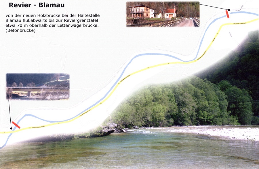 Von der neuen Holzbrücke an der Haltestelle Blamau flussabwärts bis zur Reviergrenztafel etwa 70 m oberhalb der Lettenwagerbrücke erstreckt sich das Revier Blamau (II). Auf 4,0 km Länge drängen sich hier die Äschen in flachen Rieselstrecken aneinander. Unterbrochen von tiefen Zügen in denen sich so manche große Forelle wohlfühlt, bietet sich dem Fischer hier ein sehr abwechslungsreicher Gewässerabschnitt.
