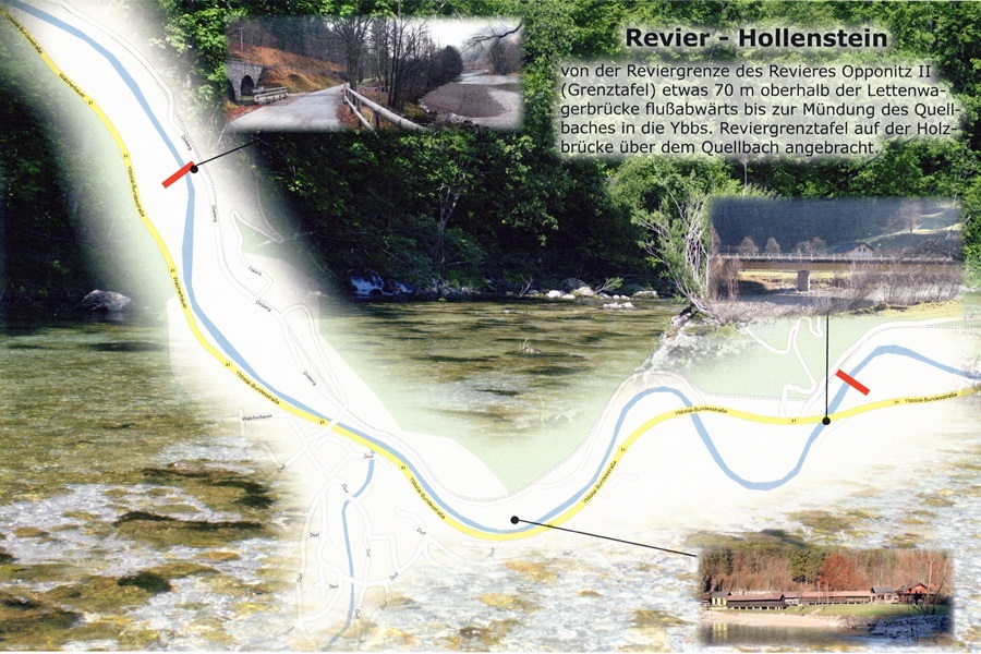 Ungefähr 70 Meter oberhalb der Lettenwagerbrücke, direkt am unteren Ende des Reviers Blamau (II), beginnt das Gastrevier Hollenstein. Wie im Revier Blamau (II) setzt sich das sicherlich gute Fischvorkommen aus je einem Drittel Bach-, Regenbogenforellen und Äschen zusammen. Das insgesamt fast 4 km lange Revier ist durchgehend leicht begehbar, wobei Watstiefel völlig ausreichend sind. Nachdem die Ybbs den Ort Großhollenstein passiert hat, endet das Revier bei der Brücke über dem Quellbach der – flussabwärts gesehen – rechtsufrig in die Ybbs mündet. Viele Gäste lieben diese Strecke im oberen Ybbstal nicht nur wegen des ausgezeichneten Fischbestandes. In der Lieblichkeit des Tales finden Sie, in den beim Fischen eingelegten Pausen, Ruhe, Erholung und Entspannung.