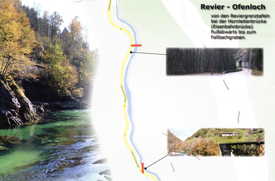 Das Revier Ofenloch (I) beginnt bei der Hornleitenbrücke und bietet durch seinen schluchtartigen Charakter eine echte Herausforderung für den anspruchsvollen Fliegenfischer. Auf rund 1,5 km Länge, die beidufrig befischbar sind, lohnt es sich sorgfältig und vorsichtig zu pirschen. Hinter jedem im Wasser liegenden Felsen, in jeder Kehre und in jedem Gumpen warten neue Überraschungen. Die schnelle des Wassers in der ersten Hälfte des Reviers mit einer Tiefe bis zu drei Metern erlaubt zuweilen nur das „Nymphen“. Daher sollte man trotz aller Begeisterung die eigene Sicherheit nicht aus den Augen verlieren. Nach Verlassen der Schlucht, die trotz ihrer Enge gut begehbar ist, drängt die Ybbs am Revierende beim Fallbachgraben in eine breite Staustufe. Hier, so wie auch in der Mitte und am Revieranfang, wurden Wege zum Wasser angelegt.