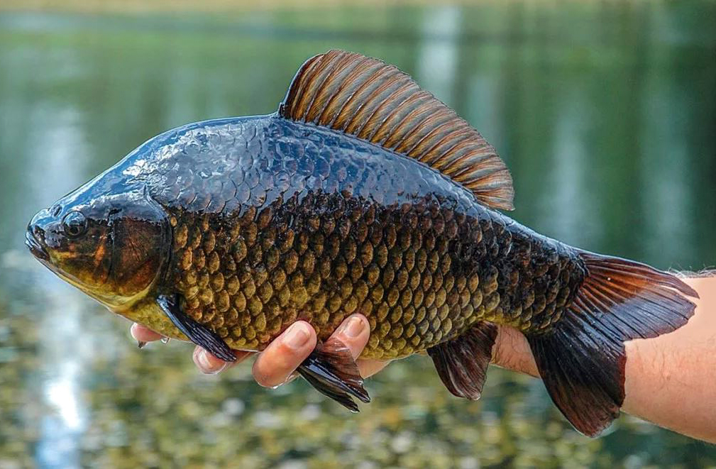 Der Körper der Karausche ist sehr hochrückig und erreicht etwa die Hälfte der Gesamtkörperlänge. Ähnlich wie beim Karpfen ist die Rückenflosse lang. Die schmalen, glattgeränderten Schlund zähne sind einreihig angeordnet. Die Grundfarbe der Karausche ist golden oder grünlich, der Rücken ist dunkler. Rücken- und Schwanzflosse sind bräunlich, die paarigen Flossen gelbbraun, manchmal rötlich. Am Schwanzstiel jüngerer Tiere befindet sich vor der Schwanzflosse ein dunkler Fleck. Karauschen sind wesentlich kleiner als Karpfen und haben am Maul keine Barteln. Auch haben sie Tendenz, zahlenstarke verbutterte Bestände zu bilden, in denen die Tiere nur 10- 15 cm lang sind. Die langsam wachsenden Fische erreichen mit 2-3 Jahren die Geschlechtsreife und laichen dann im Mai und Juni. Sie legen ihre Eier in zwei oder drei Portionen auf Wasserpflanzen oder im Wasser befindliche Teile von Landpflanzen ab. Nach 4 - 7 Tagen schlüpfen die Larven, die von Zooplankton, Benthos und Pflanzenresten leben.